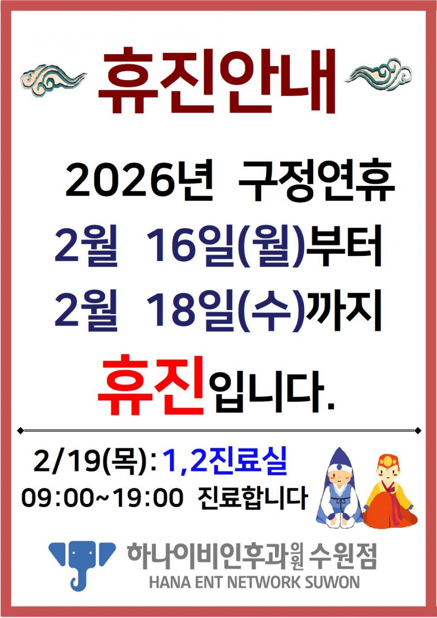 인쇄 스크랩 목록 26년 구정연휴 진료일정 안내드립니다 페이지 정보 수원하나이비인후과 95 0 2026-02-02 13:17:35 본문 인쇄 스크랩 목록 이전글 ▲3월 진료안내 다음글 ▼25년 성탄절, 26년 신정연휴 진료안내 댓글목록 등록된 댓글이 없습니다. 이전글 다음글 목록