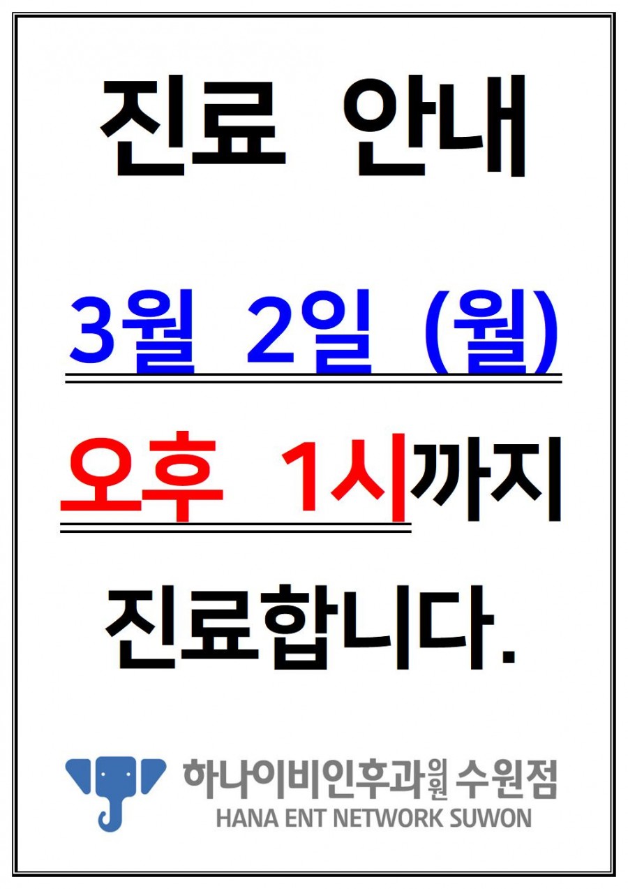 인쇄 스크랩 목록 3월 진료안내 페이지 정보 수원하나이비인후과 18 0 2026-02-23 11:50:24 본문 인쇄 스크랩 목록 다음글 ▼26년 구정연휴 진료일정 안내드립니다 댓글목록 등록된 댓글이 없습니다. 다음글 목록