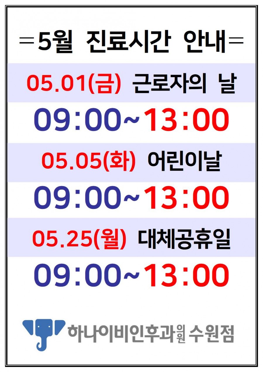 인쇄 스크랩 목록 5월 진료안내 페이지 정보 수원하나이비인후과 17 0 2026-04-16 15:43:59 본문 인쇄 스크랩 목록 다음글 ▼3월 진료안내 댓글목록 등록된 댓글이 없습니다. 다음글 목록